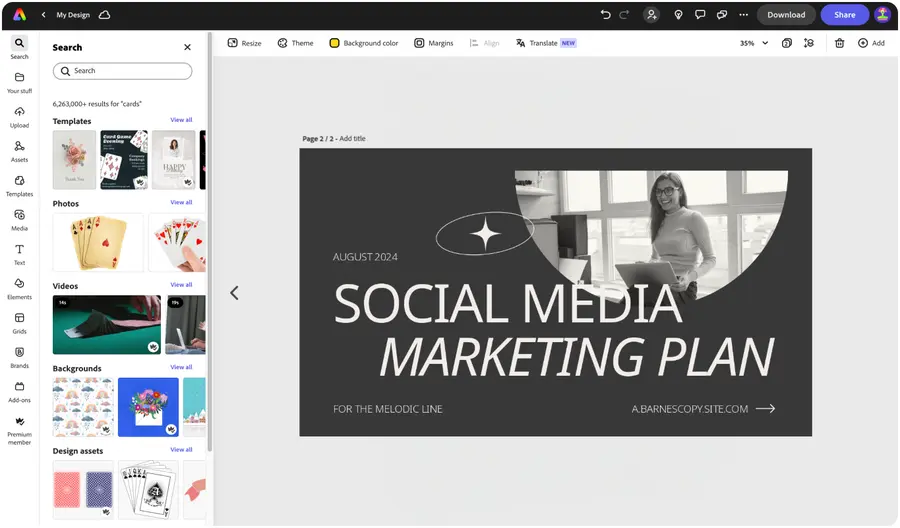 Set your business on the right path when you create a strategic marketing plan with Adobe Express. Effortlessly import and customize your own slides with tons of Adobe Stock design assets, powerful generative AI tools, and templates at your side.