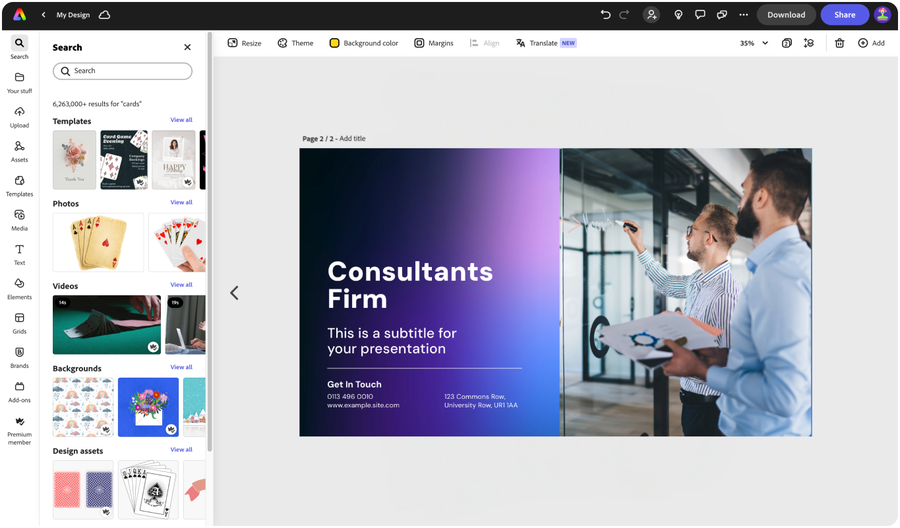 Why go solo when you have trusted colleagues by your side? In Adobe Express, you can invite collaborators to edit or leave comments with a shareable link. By sharing your work, you can be sure you’re presenting the best possible meeting deck. When it’s time to present, you can download and disseminate it as a PDF or present directly from Adobe Express. The all-in-one content creation app helps meetings go smoother, from meeting deck design all the way through presentation time.