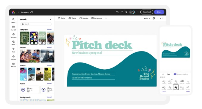 Two heads are better than one, they say. Invite trusted colleagues and peers to view, comment, or edit with a share link. When you’re ready to present your pitch deck, you can do so directly from Adobe Express or download as a PDF. Adobe Express makes creating, collaborating, and sharing pitch decks a cinch. Deliver your message in style with Adobe Express on your side.