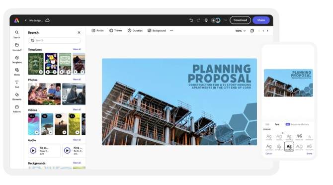 You can start your project from the Adobe Stock royalty-free photo, video, or audio collection.