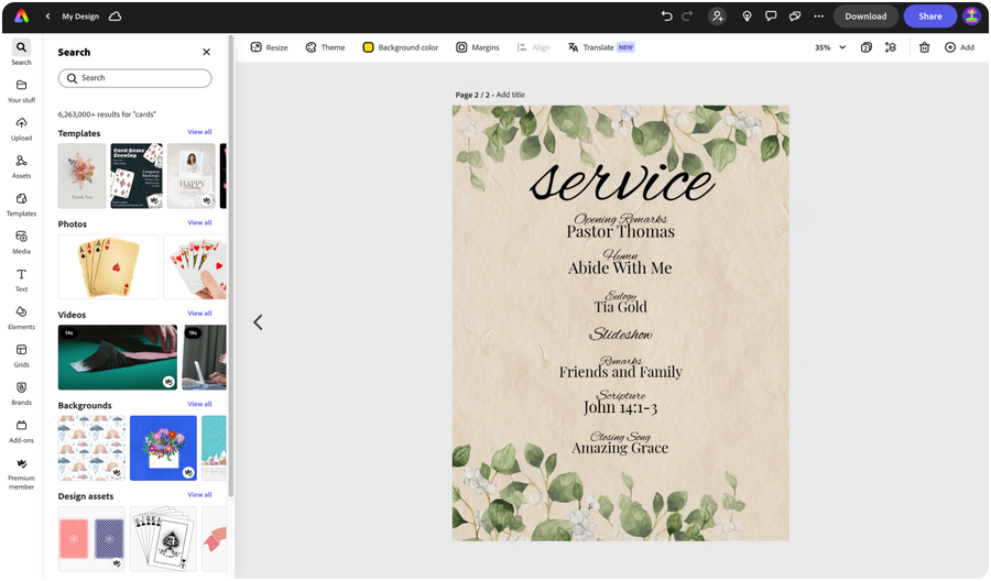 The memorial service program template you choose is only the basis for your final design. You’ll probably want something unique and personal to the deceased and their family. This is why Adobe Express is perfect for the job. Change any aspect of the template to create something that’s yours. The customization combinations are almost endless with Adobe Express. If you don’t like the color scheme in your chosen template, change it with a click of your mouse.