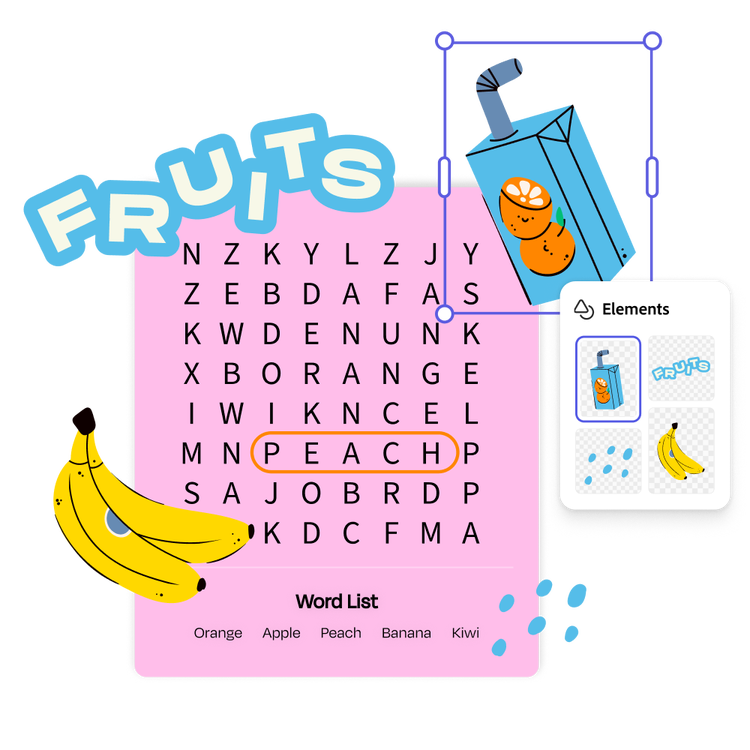 Add design elements to make your word search even more fun. Select the theme that catches your eye in the Puzzle Craft add-on. Then keep customizing within Adobe Express. Add cartoon icons or a whimsical border. You can also add text to give directions or create a story that involves all the words in your word bank.
