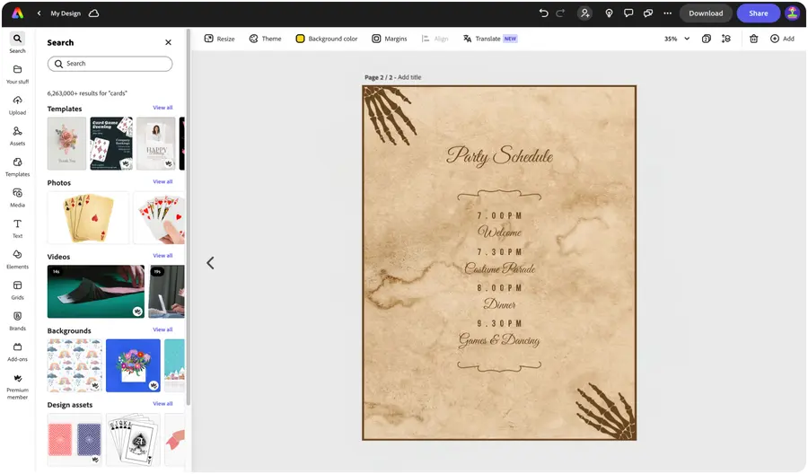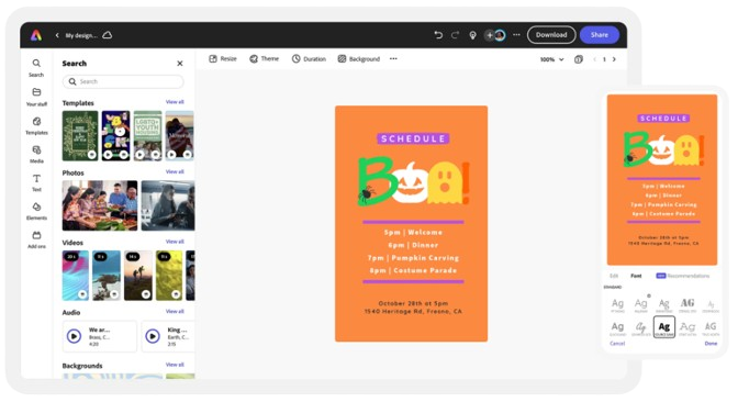 Hone your creativity with the power of Adobe Express. Explore professionally designed templates to get your wheels spinning or create your Halloween party schedule from scratch. Establish a theme for your designs using photos, icons, logos, personalized fonts, and other customizable elements to make them feel entirely authentic. Duplicate designs and resize them to create consistency across multiple types of assets.