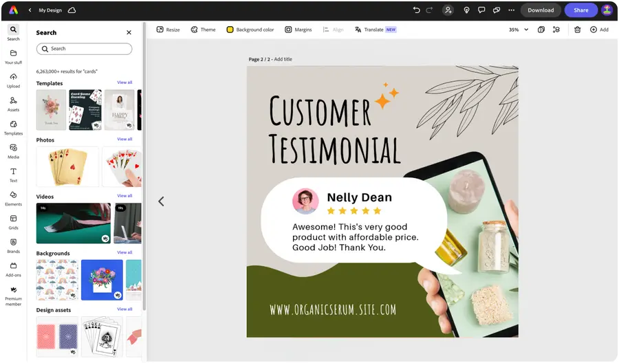 With the Adobe Express intuitive design tools, you can adjust any template until you’ve created an original masterpiece. Use the Resize tool to make your design suitable for every social platform. Move the text or add text boxes to say precisely what you need to say or adjust color schemes to fit the mood. Drop in free images, icons, and design assets to fill your design. You can even add shapes or patterns to emphasize the important parts of your message.