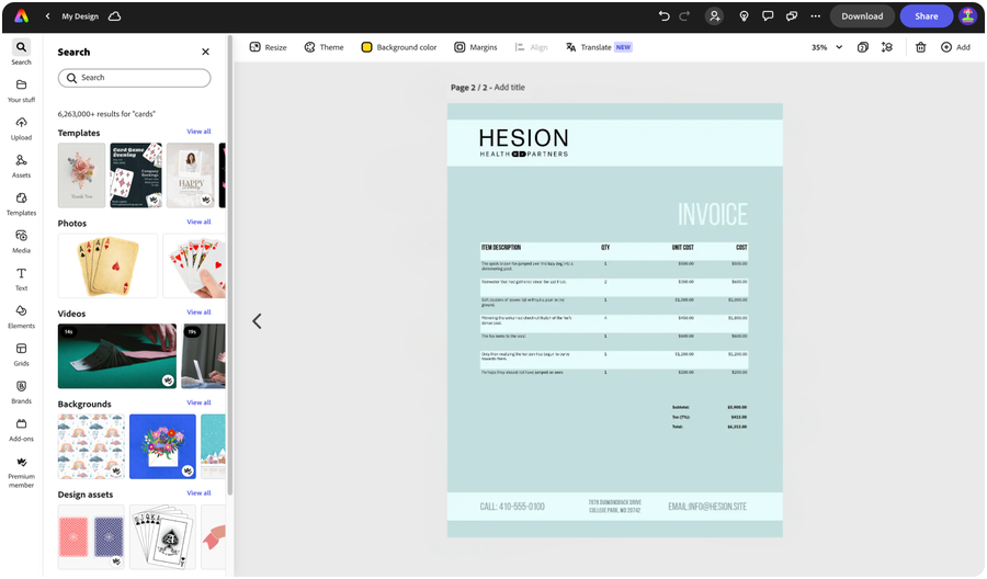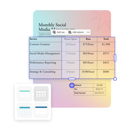 Sometimes, it’s better to do things your way. If you want to create a data table entirely from scratch, look no further. You can do so right in your presentations, documents, infographics, or anything else designed in Adobe Express. Simply choose the number of rows and columns, populate each cell with your numbers, and swap out color schemes to make it stand out.