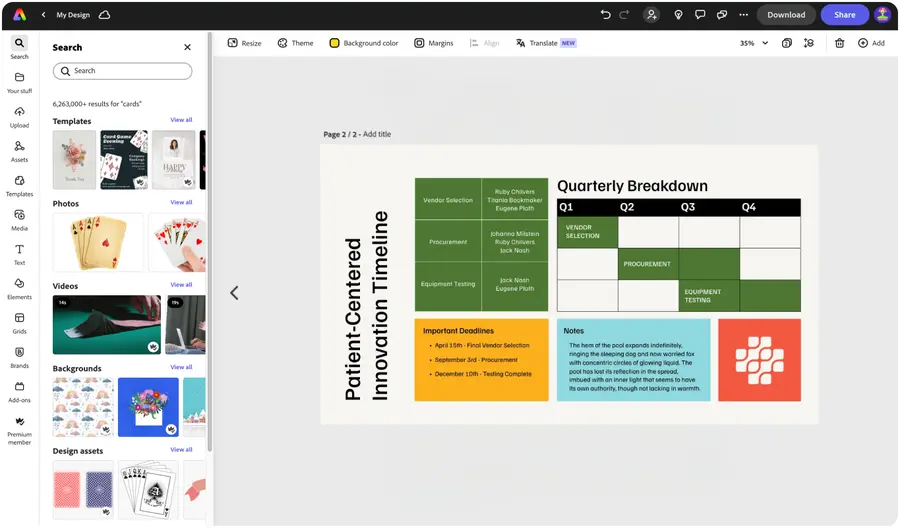 Discover how quick and easy it is to showcase a sequence of events or highlight pivotal moments in time using the Adobe Express online timeline maker. Our beginner-friendly online editor lets you customize your visual project without limits. Take personalization to the next level when you upload your logo or add a color theme to your timeline. Get things done even faster when you invite collaborators to co-edit your project at the same time.