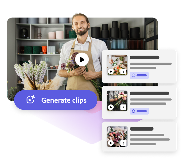Get more eyes on your videos and drive traffic to your channel with engaging short YouTube clips. Now you can let Adobe Express turn any video more than a minute in length into shorter clips ready to share. Just upload your file into the Clip Maker and wait while the tool automatically segments the best clips for you. Premium users can also Resize short videos for other platforms like TikTok and Instagram with a single click. Adobe Express makes sharing video easy and fun.