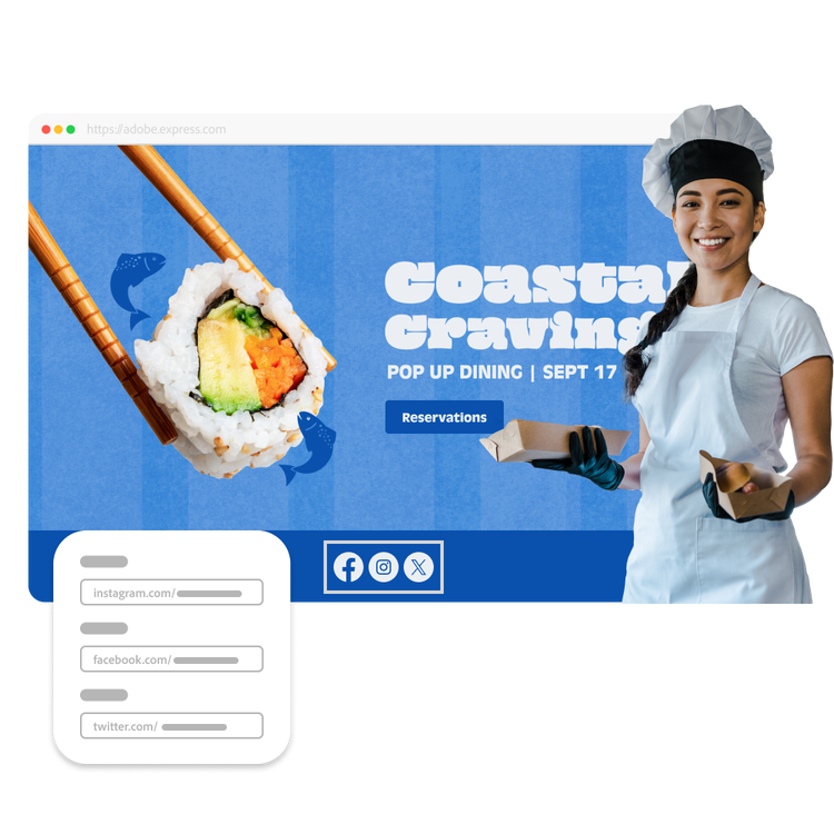 Maximize the impact of your event landing page by incorporating social media sharing options with Adobe Express. Easily add social media buttons to encourage attendees to share your event across their networks. Build buzz and reach a larger audience with minimal effort, all while maintaining a cohesive and professional look. You can also set up a password to manage who can access your event landing page.