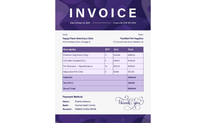 - Service invoices: Flexible formats that include line items for hourly rates, project phases, or deliverables.