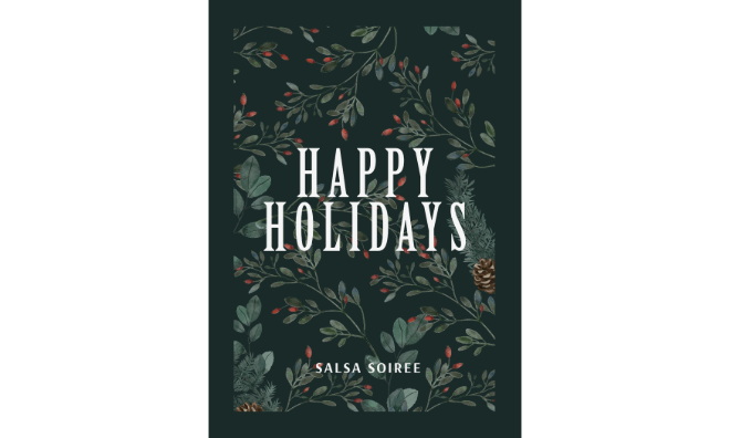 Delight your recipients with a festive holiday card. Think: cute illustrated borders featuring images of mistletoes, Christmas lights, and baubles. Or you could make your card look dramatic (yet still artsy) by using a dark background and overlaying brightly colored holiday-themed images.