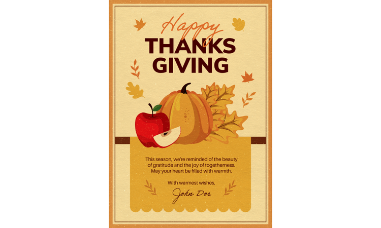 Whether you’re thanking a long-term client or recognizing your team’s hard work, well-crafted Thanksgiving messages help strengthen professional relationships. The letter templates from Adobe Express make crafting elegant, on-brand business Thanksgiving cards a breeze. Add your company’s logo, professional fonts, and subtle seasonal graphics to maintain a sophisticated yet festive look.