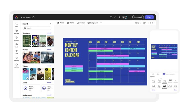 Explore professionally designed templates to get your wheels spinning or create your calendar from scratch. Establish a theme for your designs using photos, icons, logos, personalized fonts, and other customizable elements to make them feel entirely authentic. Duplicate designs and resize them to create consistency across multiple types of assets. Add, delete, or modify cells in the table to suit your needs. With Adobe Express, it’s free and easy to make, save, and share your designs within minutes.