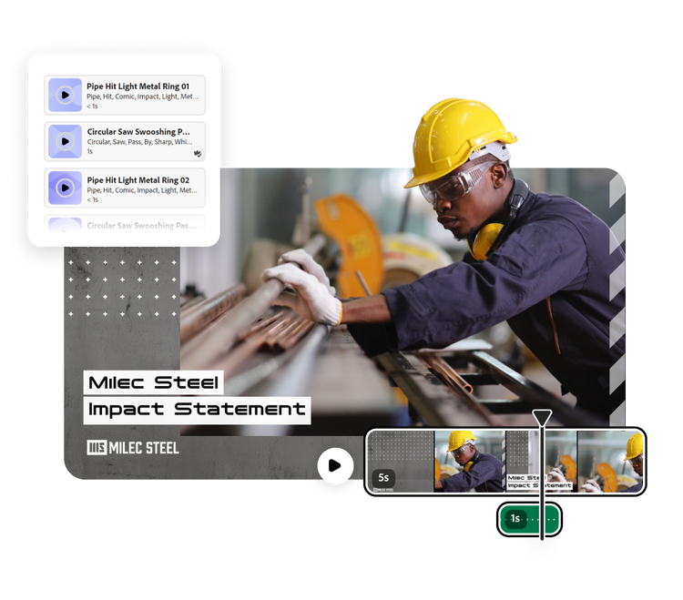 Create a video with realistic sound effects that will astound your audience. Access more than 11,000 free Adobe Stock sound effects as specific as the sound of a metal pipe to add to your social stories and videos. It’s quick and easy.