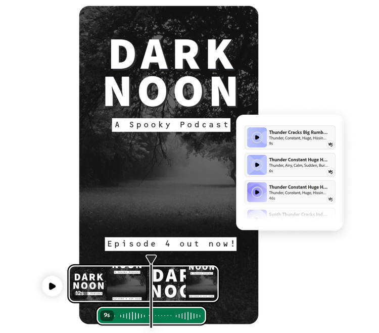 Sound plays a crucial part in video and podcast design, helping your audience understand the message you’re conveying. A well-timed sound effect can make all the difference. Adobe Express has more than 15,000 sound effects for you to browse through, including hundreds of thunder sound effects. When you’ve found the right one for your project, customizing the length, volume, and transition is easy.