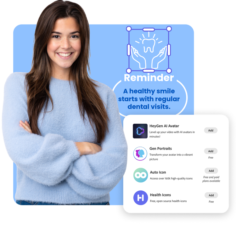 Easily install clipart related add-ons your Adobe Express editor. In the Icons Add-ons you’ll find programs that generate clipart with the use of AI, a custom avatar creator, and clipart icon add-ons specific to different professional fields like healthcare.