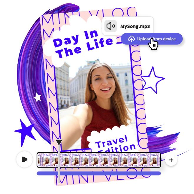 Keep your videos entertaining when you add your own music to an Instagram story or make a music video in just a few taps with Adobe Express. Import your own audio tracks directly to your project. Drop it into the video editor, then click and drag it to a specific scene to get the perfect timing, every single time.
