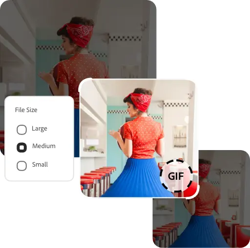 Select from one of three size options for your GIF. Choose large for a high-quality GIF, medium for GIFs you plan to share on your social media platforms, or small for low resolution GIFs that are easy to share anywhere.