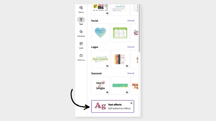 2. Begin with one of the presets found under the “Text effects” selection toward the bottom left of your text options. These pre-generated text effects were created by our team for you to use, but don't worry — you can unleash your own generative AI text effect ideas in the next step. Select any one of the examples and head to the next step.
