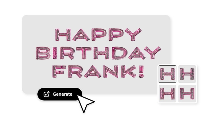 Your friends and family will flip out over the surreal detail and creativity you’ve put into their birthday cards. The only thing cooler than seeing your name in lights might be seeing it in metallic balloons. The template below is a great vibe to build on with a striking, custom touch. Then, put on the ritz with a text effect prompt in Firefly, like “Pink metallic mylar balloon with strings on the bottom,” and move on over to Adobe Express to button up the layout on your very, very custom birthday card.