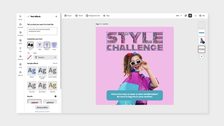 4. With some inspiration from our template, we changed the text prompt to read “neon pink and turquoise polyester windbreaker fabric,” generating the perfect accompanying font to match template’s central graphic and the flier’s overall vibe. With your custom text effect generated, you can change your headline to read whatever you want. Then just edit your unique generative ai-made message using Adobe Express’ easy-to-use text editing features.