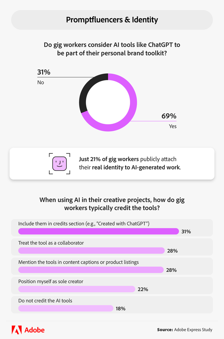 A majority of gig workers (69%) now consider AI tools an essential part of their personal brand toolkit. Whether they're using it to brainstorm ideas, polish drafts, or generate first-pass designs, AI is helping people deliver creative work faster and more confidently. However, many are cautious about how their use of AI is perceived. Only 21% of gig workers publicly attach their real name or identity to AI-generated content.