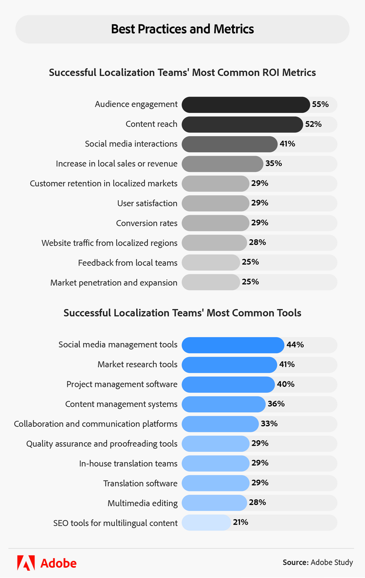 Additionally, successful teams were also more likely than less successful teams to focus on increasing sales, customer retention, and user satisfaction in localized markets. They relied heavily on social media management tools, market research tools, and project management software to achieve these goals. This combination of strategy, data-driven decision-making, and the right resources allows them to deliver content that connects meaningfully with their target audiences.