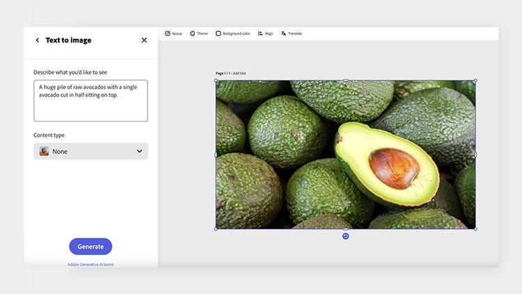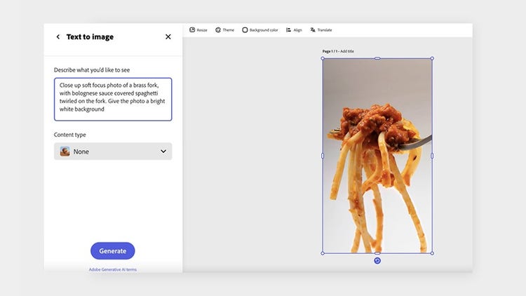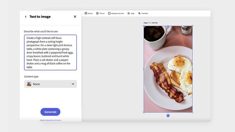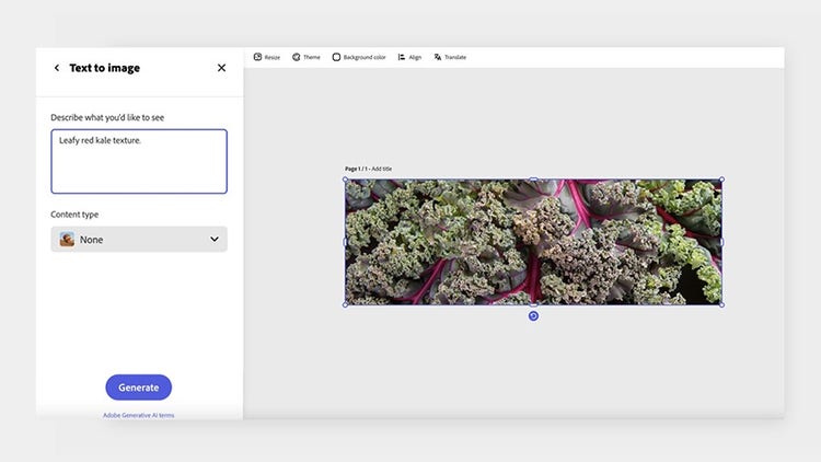 Your imagination is the cookbook and the pantry, and we’re your dream kitchen. Generate Image from Adobe Express begins with a description of the image you want to create. Take a little time practicing prompts to hone your craft — be specific, be descriptive, and be original.