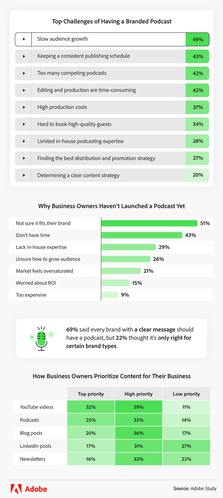But not everyone is ready to press record. The biggest barriers business owners had with starting a podcast included uncertainty about whether podcasting fits their brand (51%), lack of time (43%), and limited in-house expertise (29%).