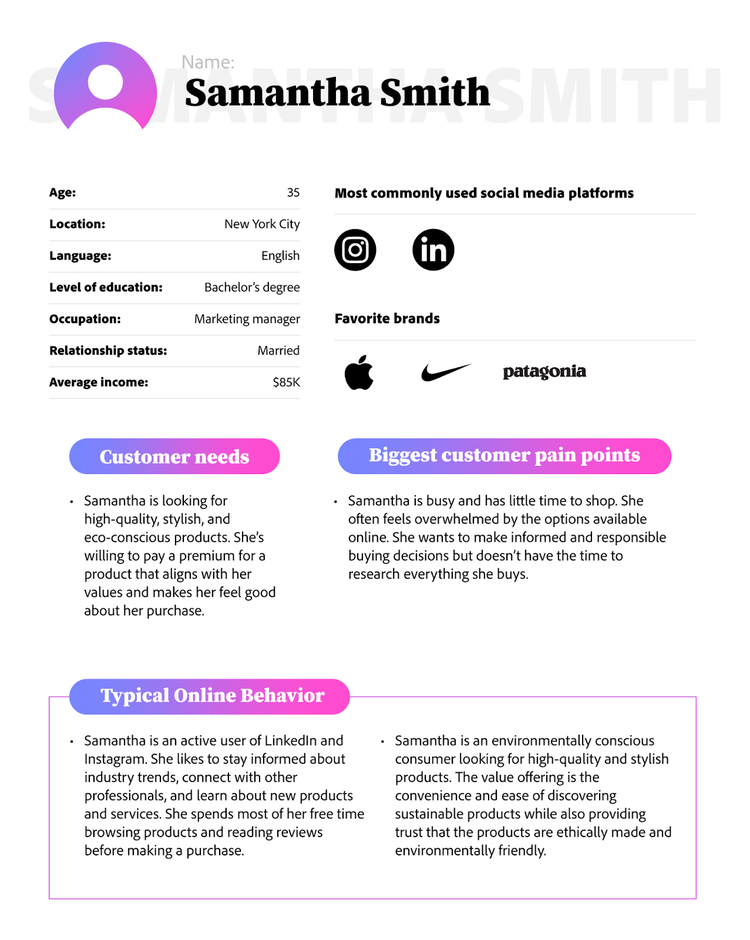 - Typical online behavior: Samantha is an active user of LinkedIn and Instagram. She likes to stay informed about industry trends, connect with other professionals, and learn about new products and services. She spends most of her free time browsing products and reading reviews before making a purchase.