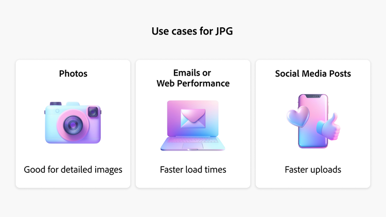 There are several reasons to convert your PNG file to a JPG. Since JPG files are a smaller file size, they’re ideal for websites, emails, and social media where fast loading is important. It’s better for photographs with gradients and complex colors, especially for portraits, landscapes, and lifestyle shots. JPG is more universally supported across platforms, apps, and devices. JPGs are usually more efficient, so if your image doesn’t require a transparent background, stick with a JPG.