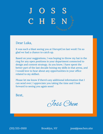The networking cover letter is fueled by a personal or professional connection. The purpose of this letter mode is to reach out, ask for employment advice, or inquire as to open position referrals within a particular company. This letter is commonly directed at contacts you’ve gained through your industry, past positions, social media platforms like LinkedIn, specific networking events or conferences, or any other environment in which referrals can be passed along. Keep it simple but personable, with the knowledge that the person to which you direct this letter would be helping you out with your job search.