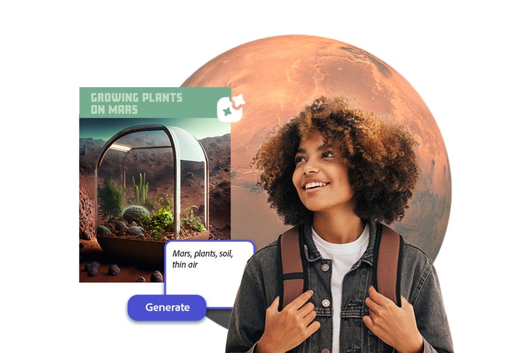 Students can further express their ideas and creativity by generating images from written descriptions. With the Generate Image feature in Adobe Express, they can type a prompt with as many details as they like, and quickly will create a high-quality image that matches their vision.