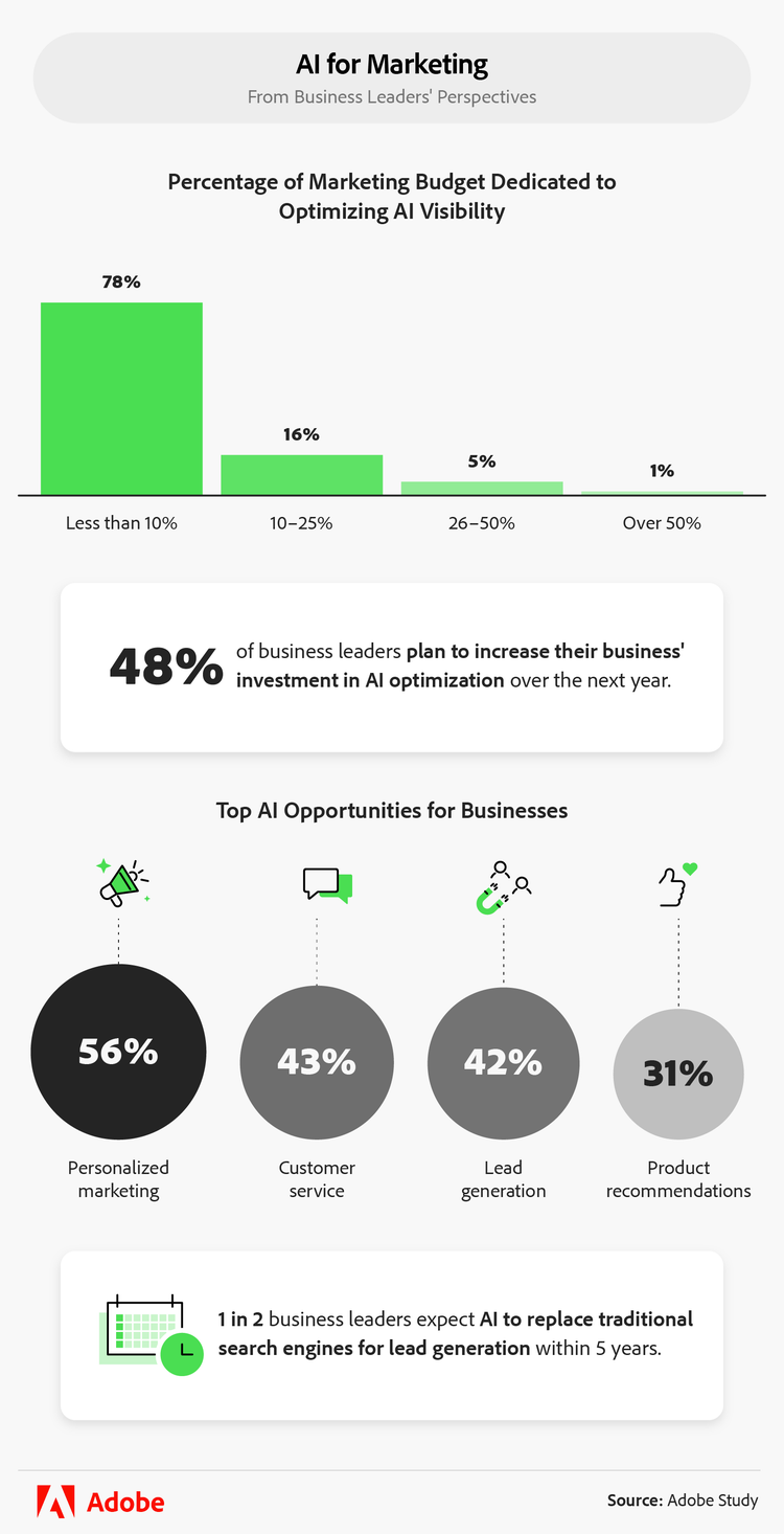 - 48% of business leaders plan to increase their investments in AI optimization over the next year.