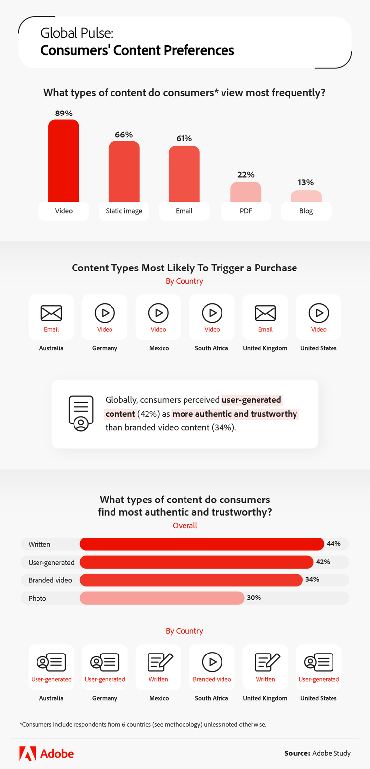 This piece explores how different kinds of content resonate with audiences worldwide and influence purchasing decisions. In addition to looking at what’s trending, we’ll dig into how different generations and regions interact with content. Get ready to gain a deeper understanding of what drives engagement and how consumer behaviors are changing in this fast-paced digital age.