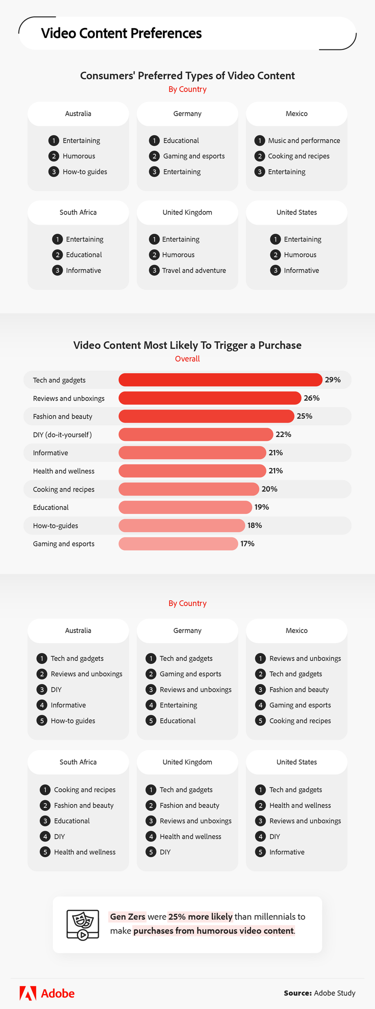- Consumers globally were most likely to make purchases from videos of the following content: tech/gadgets (29%), reviews/unboxings (26%), and fashion/beauty (25%).