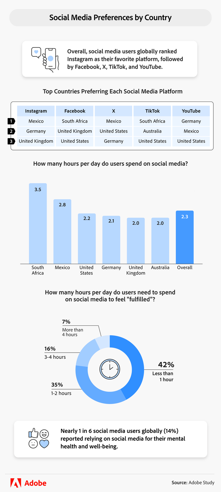 - Social media users worldwide rank Instagram as their favorite, with Mexico, Germany, and the UK showing the highest preference.