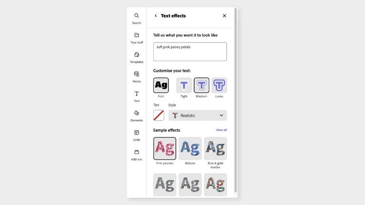 Begin with one of the presets found under the “Text effects” selection toward the bottom left of your text options. These pre-generated text effects were created by our team for you to use, but don't worry — you can unleash your own generative AI text effect ideas in the next step. Select any one of the examples and head to the next step.