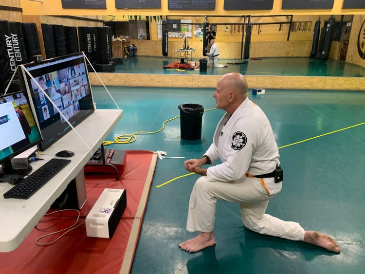 Sensei Mike of Practical Martial Arts teaching in his empty dojo-turned-virtual classroom.