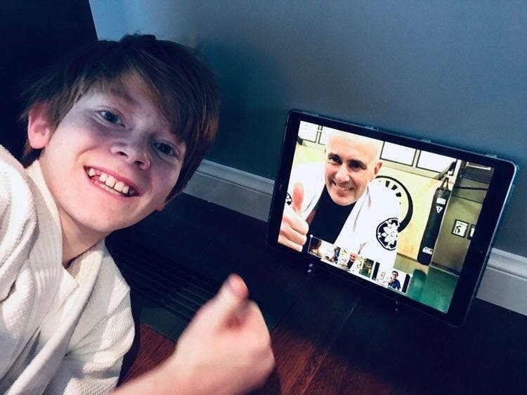 Practical Martial Arts, run by husband-and-wife duo Mike and Karen Valentine, is a dojo in California, which like many regions around the world, is in a shelter-in-place zone. It’s been in business 27 years, teaching boxing, kickboxing, Brazilian Jui Jitsu, and self-defense, with a side of life lessons to hundreds of students of all ages. On Saturday, March 14 the school closed its doors at the recommendation of the CDC and state officials in an effort to slow the spread of the virus. By Monday the shelter-in-place order went into effect. Tuesday, the family-run operation took to their basement for their very first livestream class on Facebook. By Wednesday the teachers posted 9 videos to the dojo’s social media pages to keep their students engaged and working toward their next belt. And by Thursday, they had upgraded their operation a tad, with the help of a couple volunteers, and successfully hosted four live classes of 25 gleeful students each via online conferencing platform Zoom. (Also while homeschooling their kids and managing their younger son’s nightly seizures—now that is black belt levels of agility!)