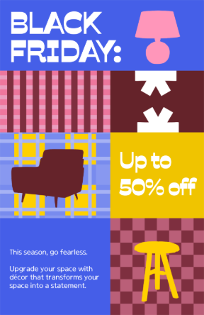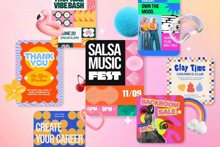 Fun, colorful, and over the top designs are ideal for events — like invitations, flyers, posters, and raffle tickets for a corporate holiday party. Home decor boutiques can also tap into this creative design. Window poster for a Small Business Saturday sale, a charity of the month postcard, a holiday sale TikTok ad, and an Instagram ad for holiday market shopping.