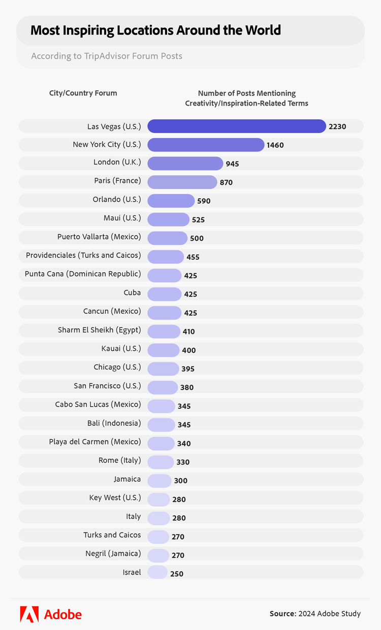 - Las Vegas, New York City, and London are the best cities for creatives to source inspiration.