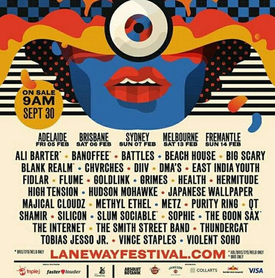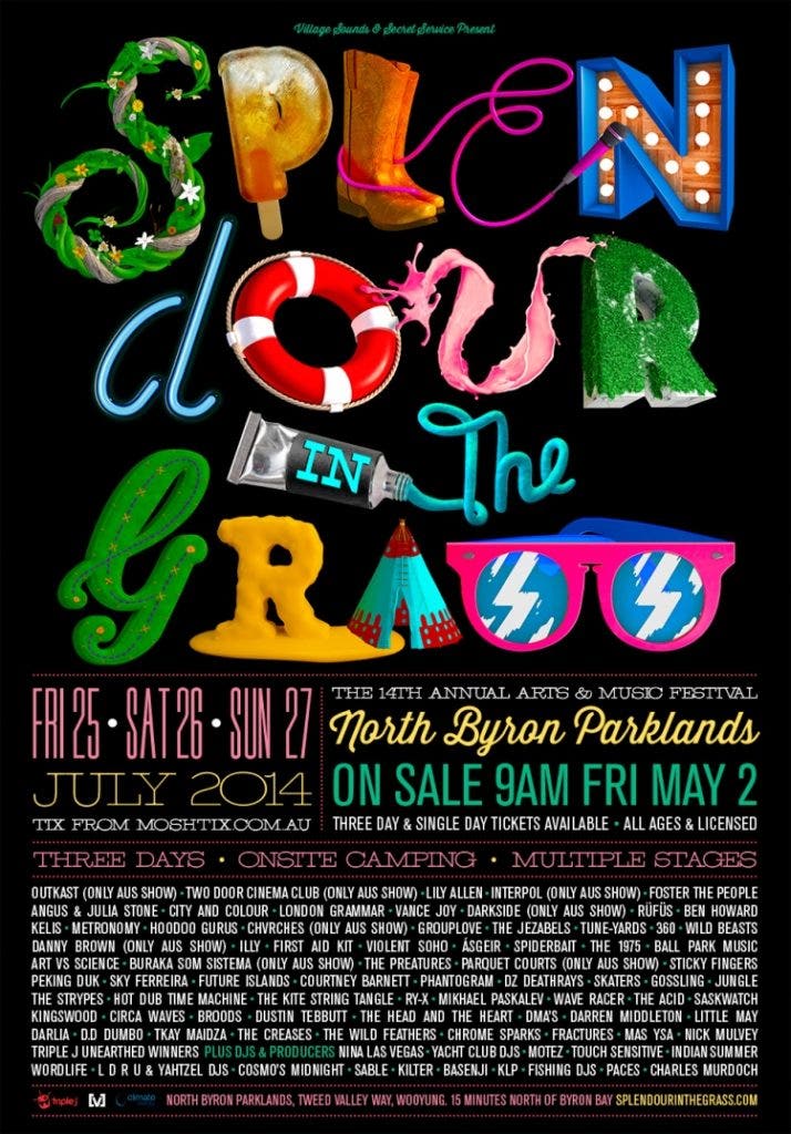 Splendour in the Grass, an Australian music festival, conveys a playful vibe by mixing unexpected images in as lettering on the festival poster. Mixed fonts that run the gamut from serif to neon add to the whimsy. Meanwhile, the all caps sans serif white wording for the headliners is kept simple to read in a smaller, sans serif font.