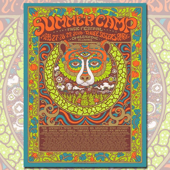 Many modern day music festival posters draw inspiration from the Summer of Love psychedelic art which began with the Monterey International Pop Festival poster and iconic music posters from The Fillmore—a historic music venue in San Francisco. This 2016 Summer Camp poster utilizes the bright colors, mystical imagery, and psychedelic font popularized thanks to 1960s’ counterculture design.