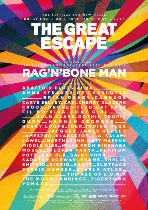 Colorful and abstract, the bright rainbow sherbet ice cream tones of the Governors Ball music festival provide a playful background for the black and white lettering. Black framing offers high relief for title and details while all caps text and consistent font size impart equal importance for all the performers. Consider using a center alignment for visual balance.