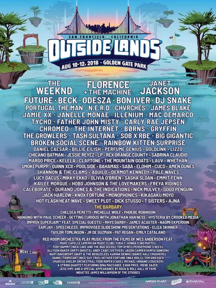 Outside Lands is San Francisco’s much-loved music festival set in Golden Gate Park. The festival’s 2018 poster featured a mix of san serif fonts, ombre sun setting colors and iconic imagery—the city’s skyline, Monterey Cypress, and the Golden Gate Bridge—to brand the event.
