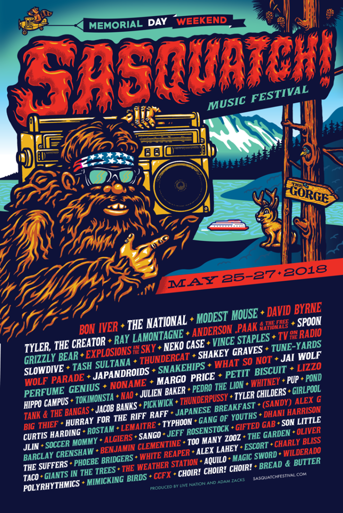 Sasquatch! Music Festival may have finished its 16-year run in 2018, but its iconic festival posters will live on. Over the years the posters always featured a Big Foot character rendered in cartoon-style art and iconic imagery of the festival’s riverside setting at the The Gorge Amphitheater. This poster uses a repeating color pattern and diagonal font design for the headliners. A creatively abstract title font echoes the Sasquatch fur, creating symmetry in design.