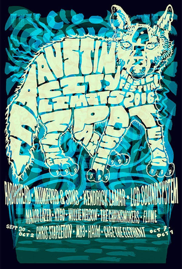 Utilize tonally similar colors in a simple color palette to balance a complex visual design like this Austin City Limits poster. The abstract design elements conjure the natural environment of Zilker Park where the festival is held. Details of the festival are incorporated into the body of the coyote, utilizing the same color palette echoed in the festival lineup.