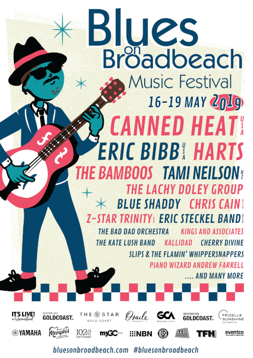 Dig the cool cat vibe to the Blues on Broadbeach Music Festival poster. You can nail the retro design trend through the use of retro icons (like those charming, twinkly teal stars), a vintage-inspired color palette, and the use of a nostalgic pattern (like the checkerboard pictured here)—not to mention through the use of old school cartoon-style drawings like this hip blues player.