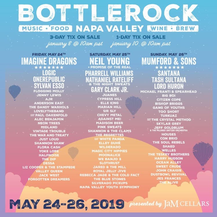 Bottlerock Napa Valley marries some of the other posters design principles, evoking a vintage, relaxed tone with soft, muted colors and distressed white font to make the performers names pop in contrast. The hot air balloon background against a blue sky points to the festival’s Napa Valley location, although the mention of the winery event presenter is likely what the region is best known for.