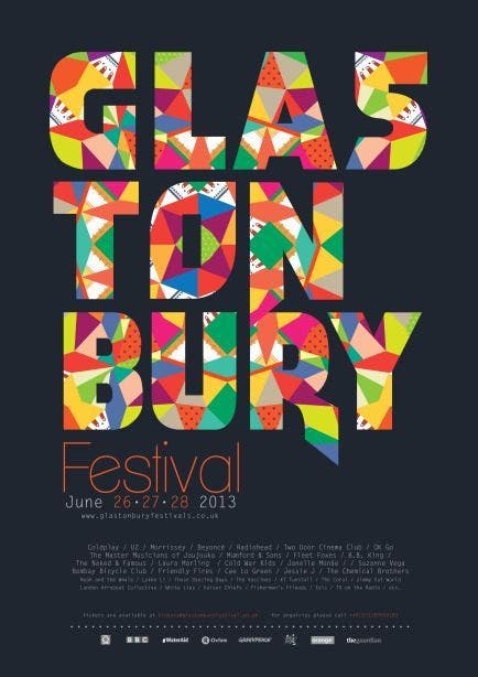 A monochromatic backdrop allows this poster’s bold, large-scale font to pop while also remaining legible. The iconic Glastonbury name takes visual hierarchy thanks to its size and the repetition of the abstract, color block pattern. The wild design in the lettering alludes to the free-spirited nature of the festival, which takes just outside the town of Glastonbury, England. Meanwhile, musical acts take second stage in subtle, white text at the bottom quarter of the design.